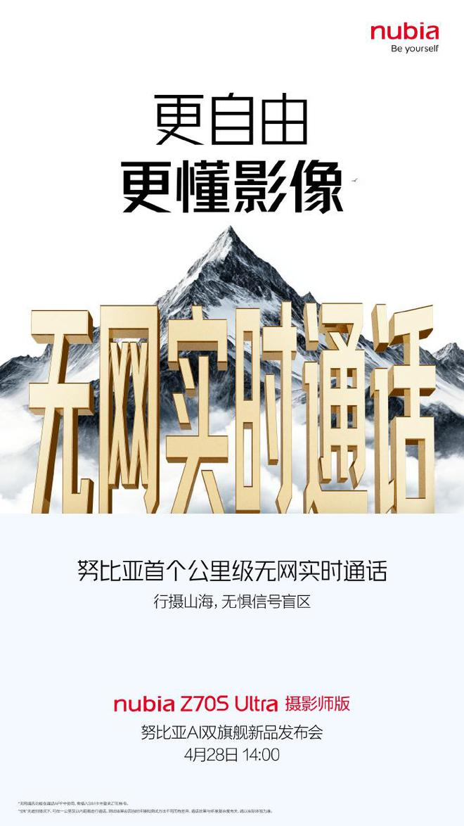努比亚 Z70S Ultra 摄影师版将搭载努比亚首个公里级无网实时通话。无网通讯功能可以在通话 App 中使用,需插入 SIM 卡并登录 ZTE 账号。空旷无遮挡情况下,可在一公里及以内距离进行通话。