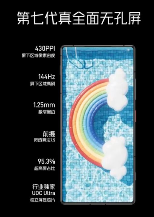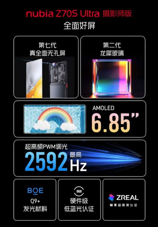 努比亚 Z70S Ultra 摄影师版搭载第七代真全面无孔屏,6.85 英寸 AMOLED 面板、144Hz 屏下区域高刷。