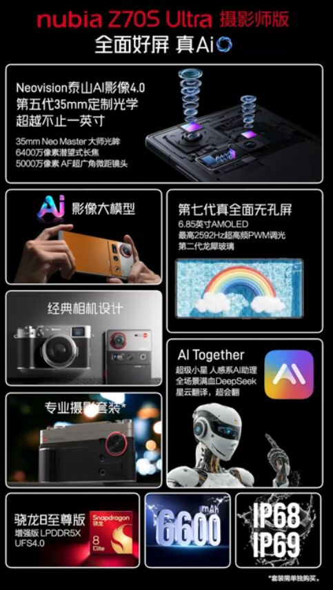 性能方面,努比亚 Z70S Ultra 摄影师版搭载骁龙 8 至尊版处理器、LPDDR5X 内存 + UFS 4.0 闪存,配有星云 AI OS 性能引擎。