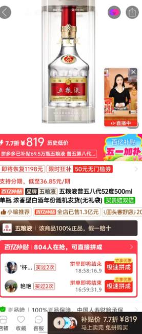 在电商平台大促活动时,五粮液第八代的价格常常出现远低于市场行情价的情况。2024年6月、11月,五粮液在电商平台的低价情况曾多次引起关注。目前,酒业内参注意到,在某电商平台的百亿补贴频道,52度500ml五粮液第八代补贴后的价格为819元/瓶。