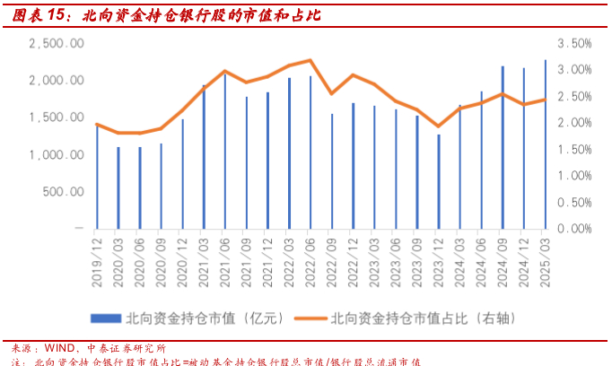 北向资金持有银行股的市值和占银行流通股总市值的比重上升:1Q25末北向资金持有银行股总市值2275.72亿元,较4Q24末环比增长4.6%,持有银行股总市值占整个上市银行流通市值2.43%,较上季度末环比上升9bp。