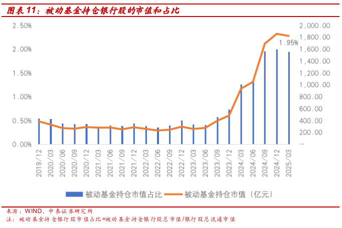 从ETF基金的规模和银行股占比来看,被动基金持有银行股的市值在经历去年的快速上升之后有所下降:我们计算跟踪沪深300、上证50、中证1000、中证500和中证A500这几大指数的ETF基金规模以及其中银行股的成分及权重,从行业角度来看,一季度末被动基金持有银行股总市值为1824.01亿元,整体规模较2024年末小幅下降1.84%。持有银行股总市值占整个上市银行流通市值的1.95%,较4Q24下降5bp。一季度科技类个股行情演绎对主要宽基指数有一定虹吸作用,沪深300/ 中证A500/ 上证50/ 中证500/ 中证1000分别下降了540/ 166/ 59/ 105/ 20亿元,从而造成被动基金持有银行股的市值及其占上市银行流通市值的比例均有所下降。