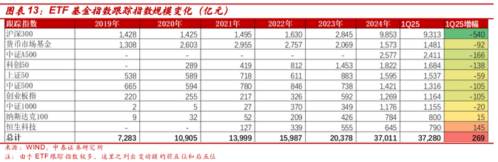 被动基金:1Q25科技类个股行情演绎对主要宽基指数有虹吸作用,被动基金持有银行股的市值及其占银行板块流通市值的比例均有所下降。1)从ETF基金的规模和银行股占比来看,科技类个股行情演绎的虹吸作用,主要宽基指数规模收缩,一季度末被动基金持有银行股总市值为1824.01亿元,较2024年末小幅下降1.84%。持有银行股总市值占整个上市银行流通市值的1.95%,较4Q24下降5bp。2)从被动基金对银行股的增减持规模来看,权重较大的招行、兴业获较大净流入,大行由于股价回调带来的权重下调、叠加主要ETF规模收缩,有一定的资金流出。1Q25被动基金整体对银行板块为净流出,流出规模为33.91亿元。从具体个股来看,1Q25招商银行和兴业银行获被动资金流入规模最大,分别为20.87/ 17.35亿元。