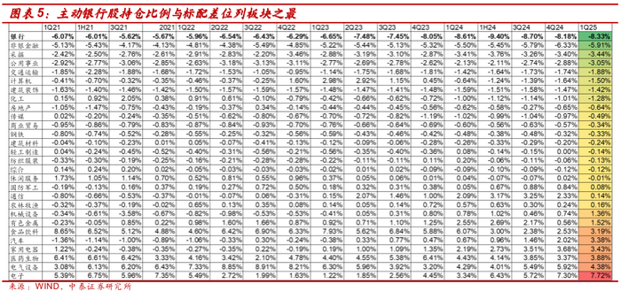 1Q25基金持仓银行股低配差为8.33%,仍处于明显低配状态,且随着一季度主动基金流出银行板块,低配差较上季度扩大14bp。银行仍是持仓比例与标配差值最大的行业,低配差自2016年来保持全行业最高,低配差排位第二的是非银金融板块,两者相差2.41个百分点