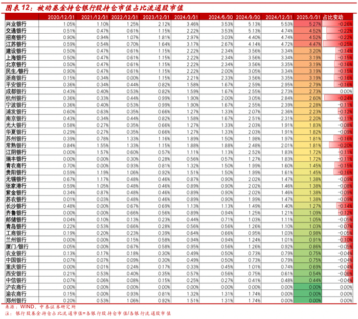 被动基金持仓银行个股占比流通市值:1、排名前五的银行基本没有变化。截止1Q25,被动基金持仓占银行流通股比重前五为兴业、交通、招商、江苏和建设银行,分别占比银行流通股总市值的5.27%、4.52%、4.52%、4.47%、3.20%。2、从基金持仓占流通股比重的变化来看,一季度主要宽基指数规模有一定收缩,因此大部分银行被动基金持仓占比流通市值均有一定幅度的下降。