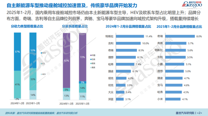 从动力类型看,新能源车型仍是搭载座舱域控的主体,2024年1-2月新能源车型占比达57%,到2025年同期虽小幅回落至53%,仍占据半壁江山。值得注意的是混合动力车型(HEV)占比从2024年1-2月的2%跃升至今年同期的14%。
