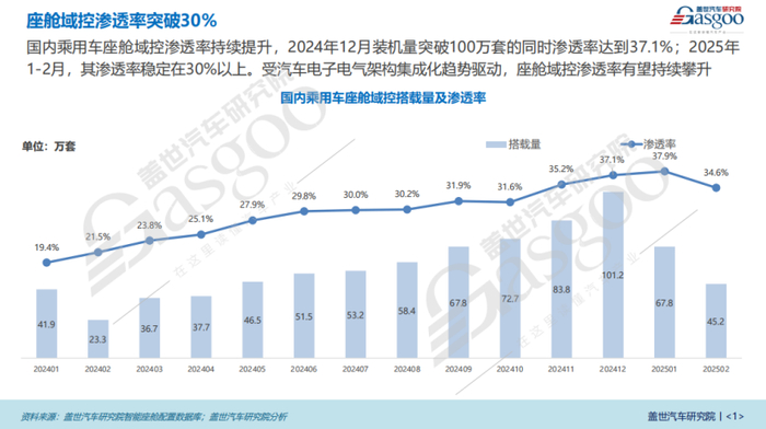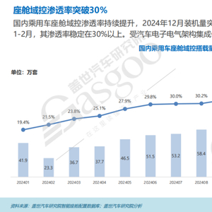 根据盖世汽车研究院数据显示,2024年12月座舱域控装机量首次突破百万套大关,达到101.2万套,对应渗透率攀升至37.1%。今年1-2月,渗透率仍稳定维持在30%以上,展现出强劲的市场需求和技术成熟度。盖世汽车研究院预测,在智能化需求持续释放的背景下,座舱域控渗透率有望持续攀升。
