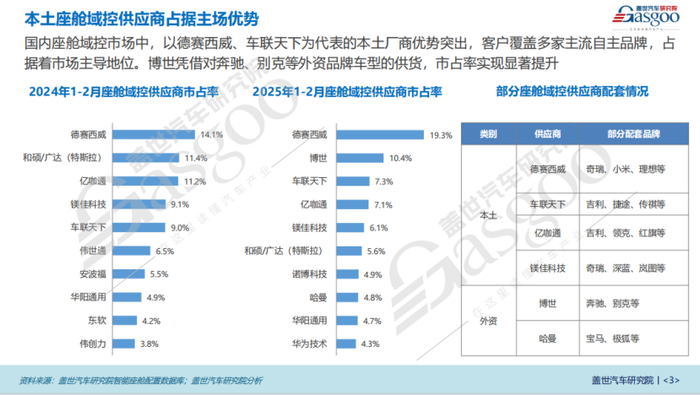 外资供应商方面,博世凭借为奔驰、别克等外资品牌车型供货,市占率实现较大的增长,在2025年1-2月达到10.4%。和硕/广达(特斯拉)市占率从2024年1-2月的11.4%降至2025年1-2月的5.6%。哈曼等外资供应商也有一定市场份额,哈曼在2025年1-2月市占率为4.8%,配套宝马、极狐等品牌。