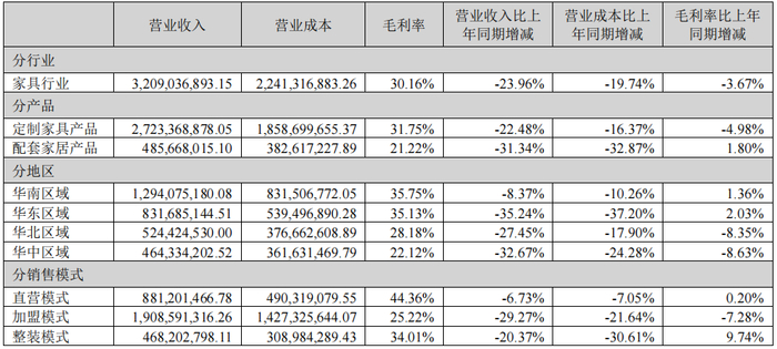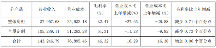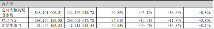 分产品来看,报告期内,定制衣柜及配套家居实现营收5.48亿元,占营收比重53.39%,同比下降25.72%;精品五金实现营收3.99亿元,占营收比重38.84%,同比下降12.24%;定制生态门实现营收6142.62万元,占营收比重5.98%,同比下降20.27%;其他业务实现营收1837万元,占营收比重1.79%,同比增长22.11%。