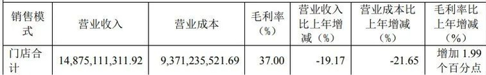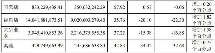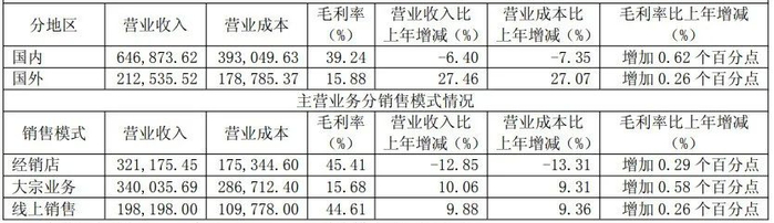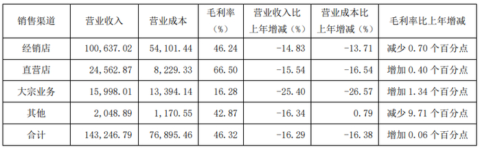 从收入渠道看,公司经销渠道实现营业收入140.42亿元,同比下降20.10%;大宗渠道实现营业收入30.45亿元,同比下降15.08%;直营渠道实现营业收入8.33亿元,同比增长 0.57%;海外渠道实现营业收入4.30亿元,同比增长34.42%。