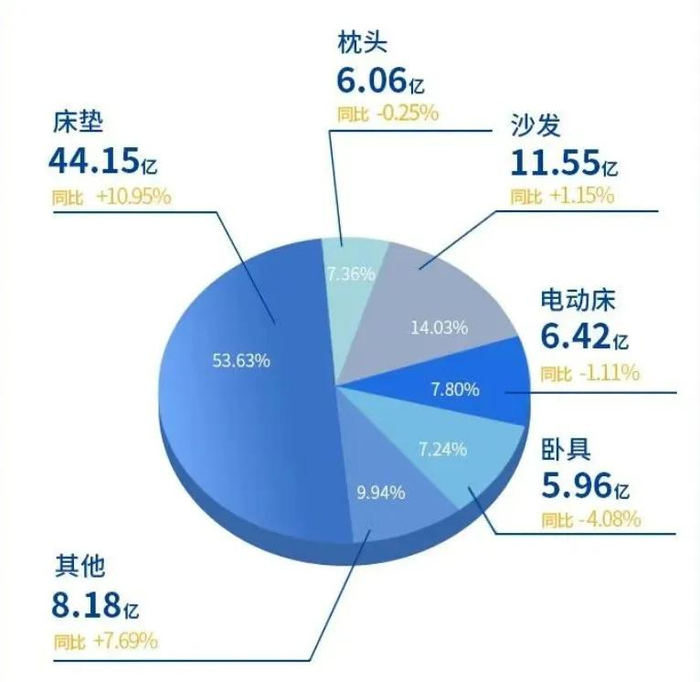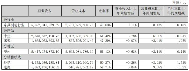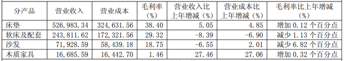 分品类来看,床垫营收44.15亿,同比增长10.95%;枕头营收6.06亿,同比下降0.25%;沙发营收11.55亿,同比增长1.15%;电动床营收6.42亿,同比下降1.11%;卧具营收5.96亿,同比下降4.08%。