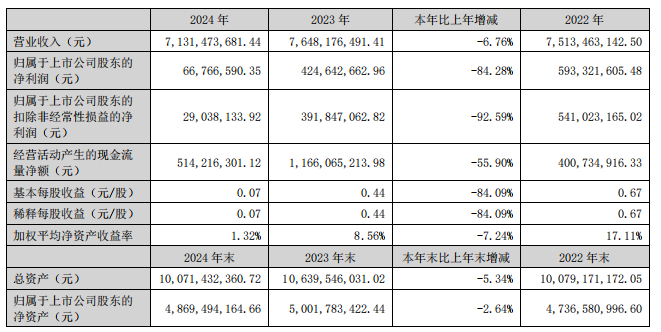4月22日,箭牌家居发布了2024年年报和2025年一季报。报告显示,2024年,箭牌家居实现营业收入71.3亿元,同比下降约6.8%;归母净利润为6677万元,同比下降84.3%。