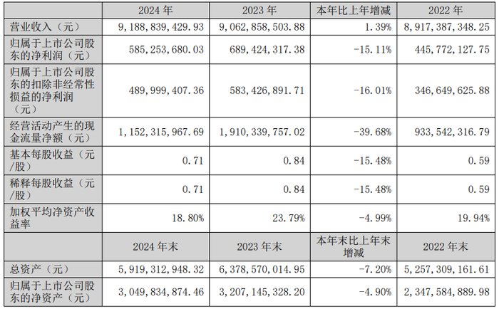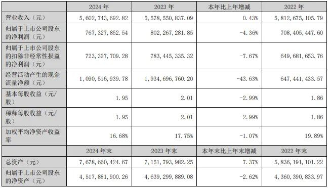 公告显示,2024年欧派家居实现营业收入189.25亿元,同比下降16.93%;归母净利润为25.99亿元,同比下降14.38%;扣非归母净利润为23.16亿元,同比下降15.65%。
