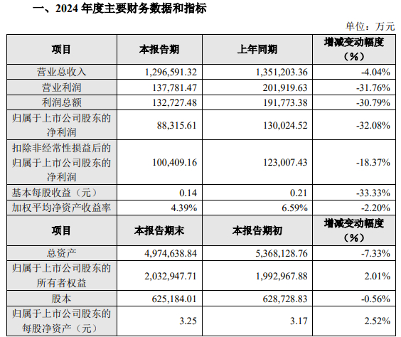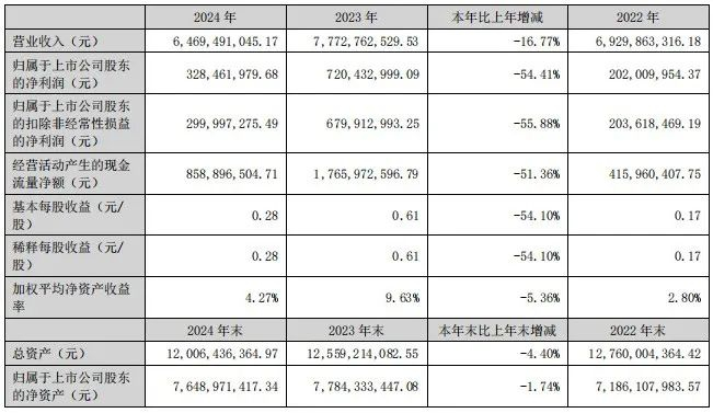4月19日,东鹏控股发布公告称,2024年实现营业收入64.69亿元,同比下降16.77%;归属于上市公司股东的净利润为3.28亿元,同比下降54.41%