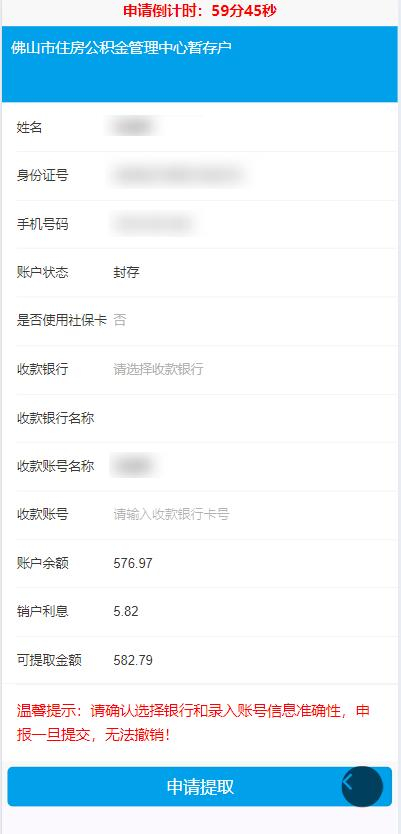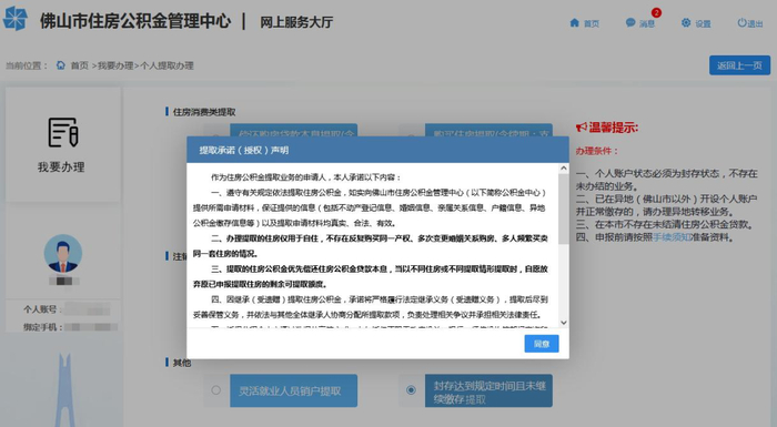 1.登录佛山市住房公积金管理中心网站(https://fsgjj.foshan.gov.cn/),在首页通过我要办理进入到办理模块,点击个人提取办理进入提取类型选择页面,点击封存达到规定时间且未继续缴存提取,点击下一步进入提取承诺(授权)声明对话框,仔细阅读《提取承诺(授权)声明》,点击同意后进入申报页面,如下图。(注:选择提取类型后请仔细阅读温馨提示,不满足提取条件的职工无法办理提取)。