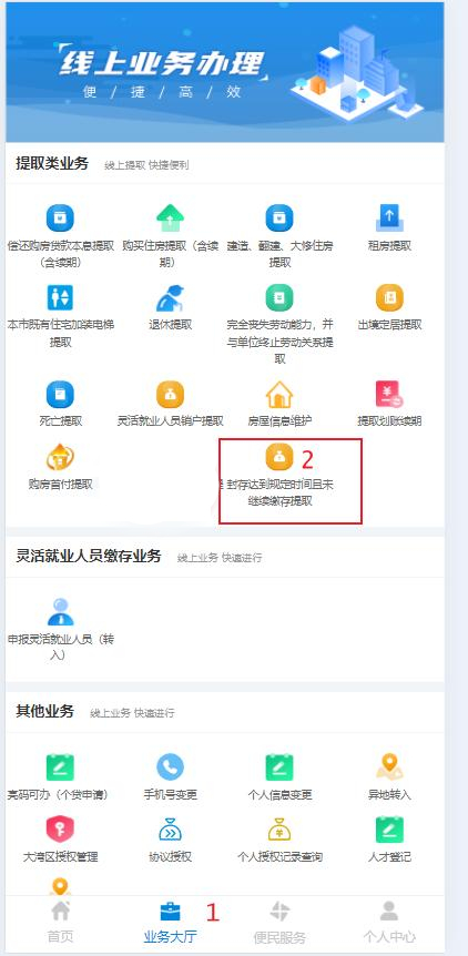 2. 首页点击业务大厅,点击【封存达到规定时间且未继续缴存提取-【我要提取阅读并同意《提取承诺(授权)声明》,进入申报页面。如图: