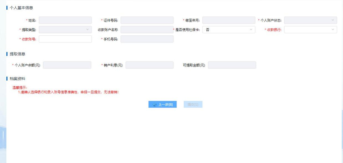 2. 选择收款银行,录入收款账号,提交后完成提取申请,具体办理进度可在【我要查询】- 【提取】-【个人提取业务】中查看。