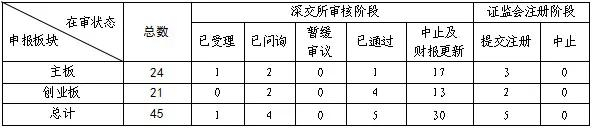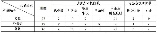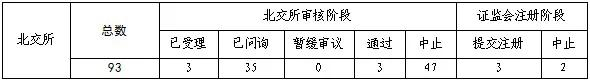 截至4月27日,各板块在审企业共184家。其中上交所46家(主板27家,科创板19家),深交所45家(主板24家,创业板21家),北交所93家。