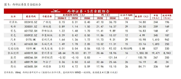 基于以上配置策略,2025年5金股组合推荐如下:广联达(计算机)、特锐德(电新)、华峰铝业(有色)、华菱钢铁(有色)、吉利汽车(汽车)、长城汽车(汽车)、极兔速递(交运)、贵州茅台(食品饮料)、泽璟制药(医药)、阿拉丁(医药)、珀莱雅(商社)。