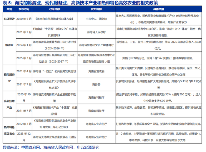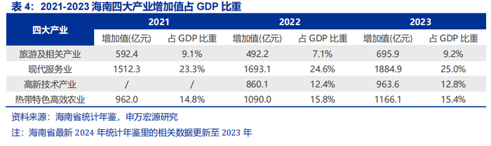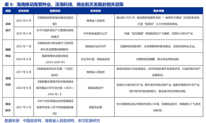 构建现代产业体系,加码四大主导产业,布局三大未来经济。四大主导产业(旅游及相关产业、现代服务业、高新技术产业、热带特色高效农业)在2023年对海南GDP的贡献比重达62.4%,其中,现代服务业在2021-2024年年均增速9.2%;高新技术产业则以数字经济、石油化工新材料、现代生物医药为核心赛道,加速创新要素集聚。三大未来产业分别是:『1』以国家南繁硅谷建设为依托的种业科技;『2』聚焦深远海装备研发、海洋资源开发的深海科技;『2』以文昌国际航天城为载体,构建集火箭研发、卫星应用于一体的商业航天。