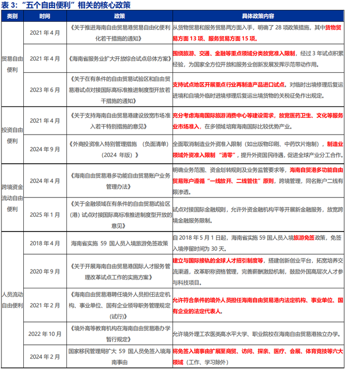 贸易、投资自由便利是核心,意在吸引企业、带动投资,而剩下 “三自由便利+ 一个安全有序流动”是上述目标的重要支撑。贸易自由便利,意味着“零关税”大幅降低成本,企业得以轻装上阵、利润空间显著提升;投资自由便利,则指向对外资的开放——大陆尚未放开的领域在海南可能准入布局。当这两大政策在2035 年全面落地,海南对国际资本的吸引力必将实现质的飞跃。同时,企业真正落户后,生产链条中的资金、劳动力、数据三大要素,同样需要实现跨境自由流动:若经营所得利润跨境汇出存在障碍,外籍人才出入境及停居留便利化程度不足,数据跨境流动面临限制性壁垒,企业长期运营也将面临实质性挑战。因此,这三大要素的自由便利,堪称贸易投资自由便利的底层支撑——打通 “财、人、数据” 的流动经脉,让政策优势真正转化为产业集聚的澎湃动能。