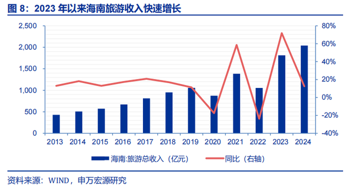 上述政策举措已显现显著成效。2024年,海南省接待游客量超9720万人次,旅游收入达2000亿元以上,2019-2024年旅游收入年复合增长率达14%。