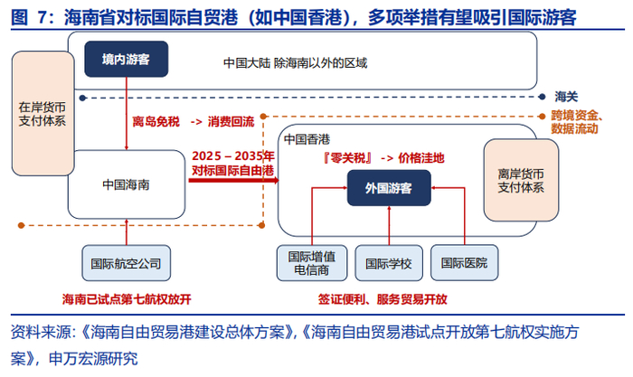 打造国际旅游中心,推动高端消费回流,同时展现中国魅力,吸引海外游客消费。(1)吸引全球游客:以中国香港为参照,其国际旅游枢纽地位源于自贸港制度赋予的签证便利、教育医疗国际化、增值电信开放、资金自由流通等优势;而海南作为全国唯一全热带省份,区域面积超香港,形成差异化竞争力。(2)促进消费回流:过去十年中国中高收入群体扩容催生海外消费热潮,海南从多方面促进消费回流:离岛免税购物(额度提至10万元)、乐城国际医疗旅游(“医疗特区”集聚200余种国际药械)、陵水黎安国际教育(“境内关外”模式)。其旅游数据彰显成效,2024年接待游客超9720万人次,2019-24年旅游收入复合增长率达13%。