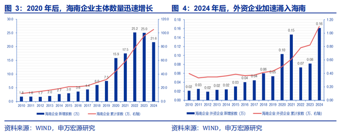 四大政策叠加,海南变身“税收洼地”,企业数量大幅增长。具体而言:『1』鼓励类产业,产品若加工增值超过30%,则经‘二线’进入内地免征关税。『2』封关运作后,对负面清单以外的商品,免征进口关税。『3』封关运作后,注册在海南自由贸易港并实质性运营的、非负面清单行业企业,减按15%征收企业所得税。『4』2035年前,形成“低税率(个人所得税率分三档,最高15%)、宽税基”的税制,吸引国际人才。随着全岛封关运作完成,区位优势+税收洼地,有志于出海的中国制造业加速南下,渴望日益增长中国市场的外资企业迅速北上,都将在海南找到属于自己的位置。过去几年间海南招商引资已经走出Alpha:2020-24年,每年的新设企业数均超过15万家;其中外资企业增速更高,2024全年新设1617家,创历史新高;2025Q1新设461家外资企业,同比增速高达59.5%。
