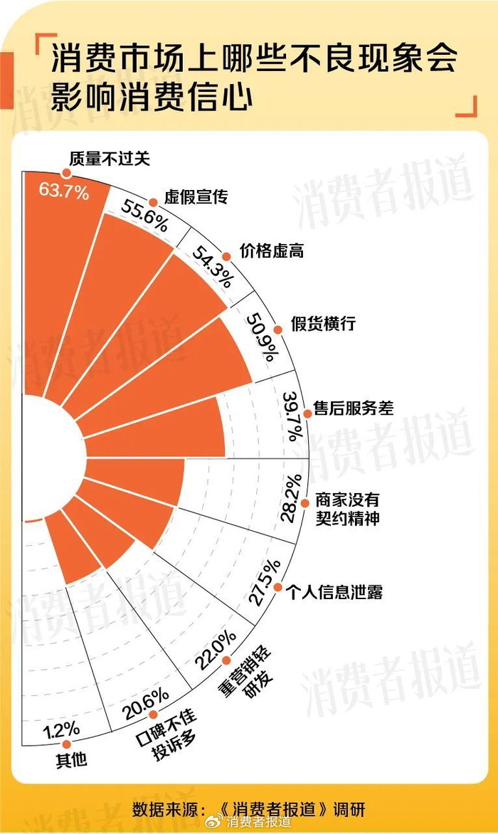 消费市场上的部分乱象会影响消费信心。根据《消费者报道》调研结果,影响消费信心的因素主要有质量不过关(63.7%)、虚假宣传(55.6%)、价格虚高(54.3%)、假货横行(50.9%)和售后服务差(39.7%)。