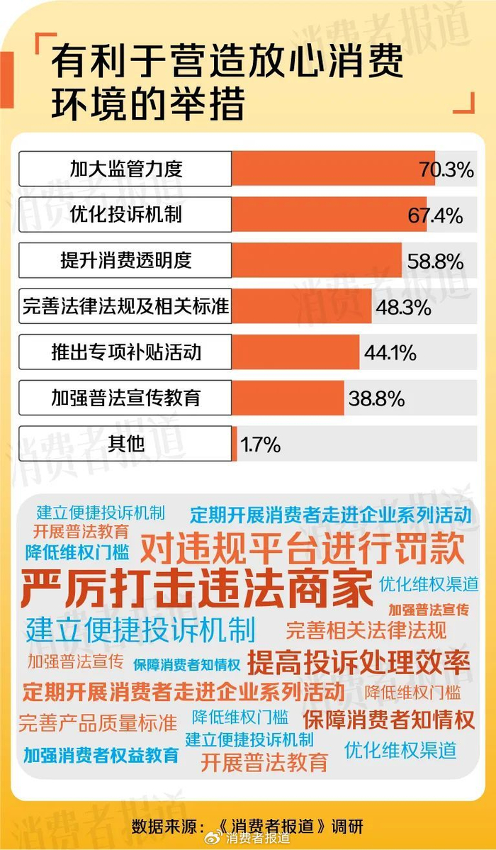 营造放心消费环境是提振消费信心的的关键突破口。最新调研数据揭示了消费者对营造放心消费环境的几大核心诉求。受访者认为加大监管力度(70.3%)、优化投诉机制(67.4%)、提升消费透明度(58.8%)、完善法律法规及相关标准(48.3%)等举措有利于营造放心消费环境。
