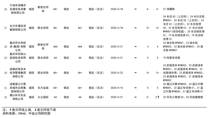 本周评级行动共33项,均为关注行动,涉及3项中金评分调整:承德国控人由5+上调至4-;眉山环天由5-上调至5;萍乡国资由5+下调至5。