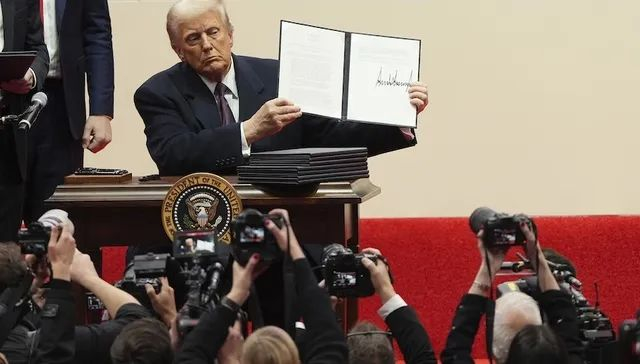 2025年1月20日,美国华盛顿,特朗普总统在室内总统就职游行活动中签署了一项行政命令并举起该命令。图源:CFP