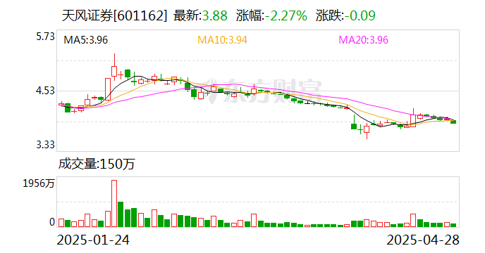 证券时报·数据宝统计显示,天风证券今日收盘价为3.88元,下跌2.27%,日换手率为1.73%,成交额为5.86亿元,全天主力资金净流出9513.57万元,近5日该股累计下跌4.20%,近5日资金合计净流出2.20亿元。