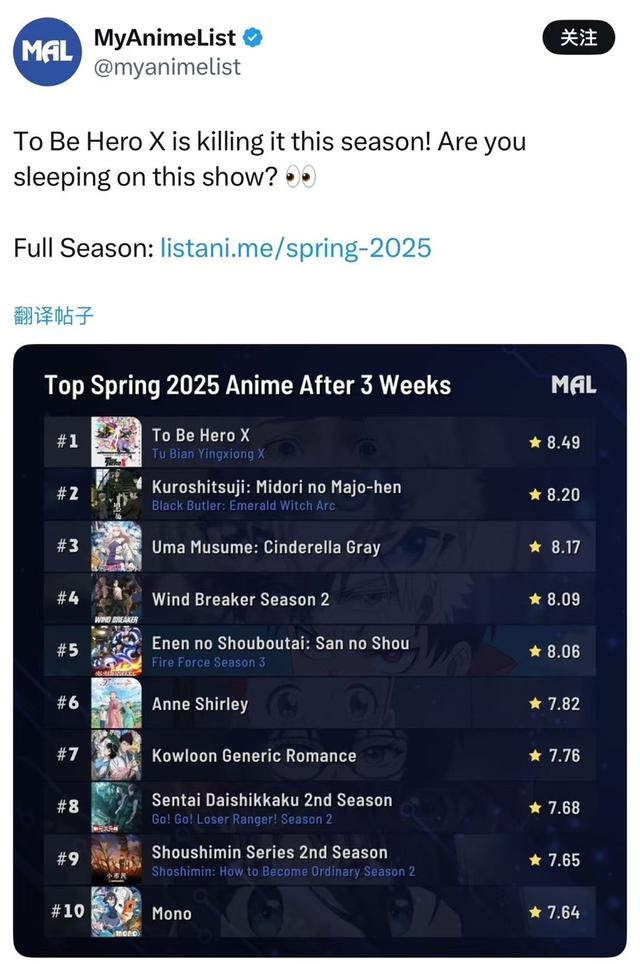 在MyAnimeList上,《凸变英雄X》获得8.49分