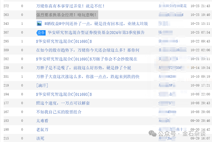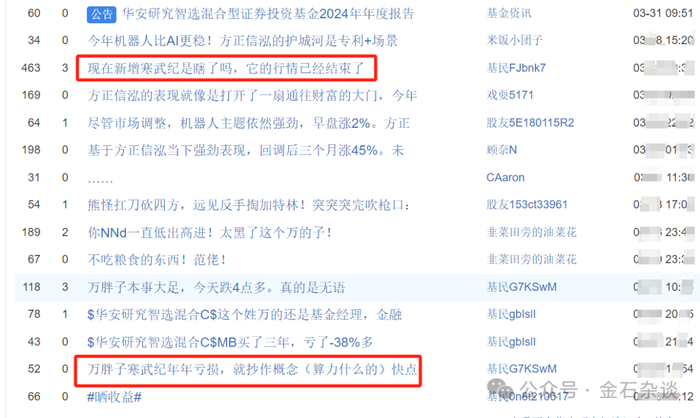 在社区平台,有基民也吐槽其仓位变动,尤其高位去寒武纪:现在新增寒武纪是瞎了吗,它的行情已经结束了。此前,基民纷纷吐槽:非常差,没见过这么差的基金经理;连跌8天了;老鼠万;强烈要求换基金经理!啥玩意啊!