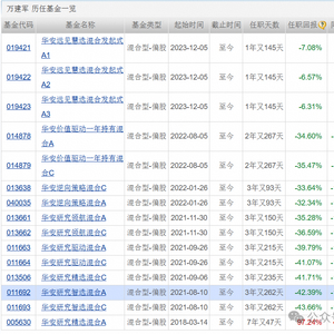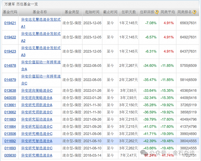 根据东方财富数据,万建军目前共管理7只基金,除了一只产品任职回报为正,其他所管产品全部负收益,华安价值驱动一年、华安逆向策略、华安研究领航任职亏损均超30%,华安研究精选混合和华安研究智选则均跌超40%。