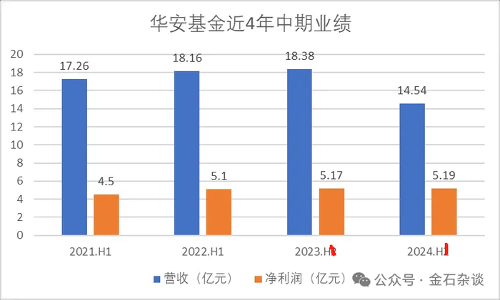 金石杂谈查询发现,华安基金近4年业绩有所波动,22年中期营收增长了近1亿,但23年放缓,24年直接下滑了20.89%或近4亿;利润方面,公司近三年利润一直维持在5亿上方。24年中期增利不增收,或和降本增效有关。