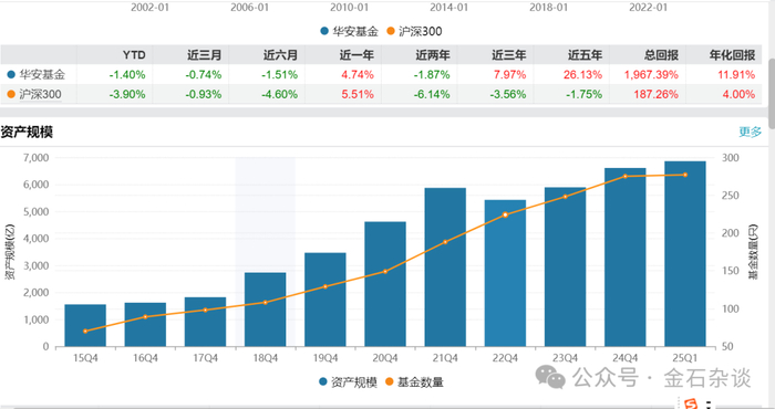 华安基金是国内“老十家”首批公募,规模高达6600亿,虽然22年和23年规模有所波折,24年规模再度增加了近千亿。这家公募由国君持股51%,国君资管持股20%。就近三年业绩来看,三年盈利7.97%,两年则亏损1.87%,近1年盈利4.74%,但近半年则亏损1.51%。