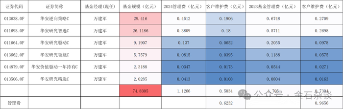 最后,简单看下,万建军给华安基金贡献的管理费。据金石杂谈统计,万建军2023年给公司贡献了9656万管理费(扣除渠道),2024年贡献了6232万管理费。