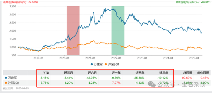 根据wind数据,万建军近三年亏损19%,近两年亏损超25%,近1年大跌10%,近6个月跌12%,近3个月跌8.44%,全部跑输基准指数。