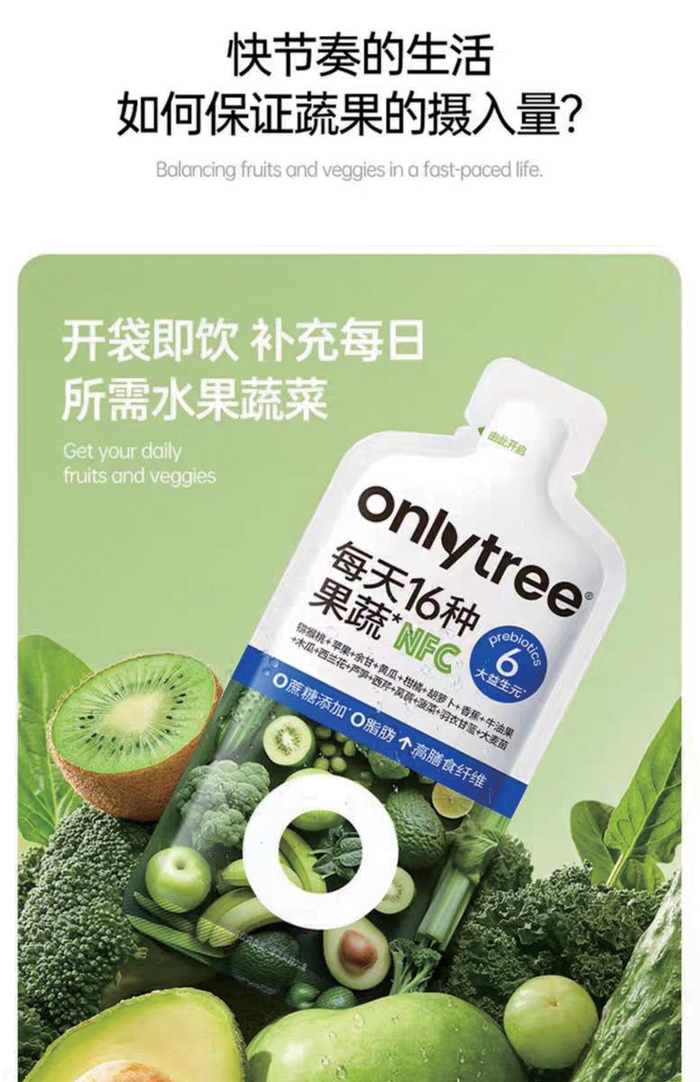onlytree“液体沙拉”宣称“补充每日所需水果蔬菜”。