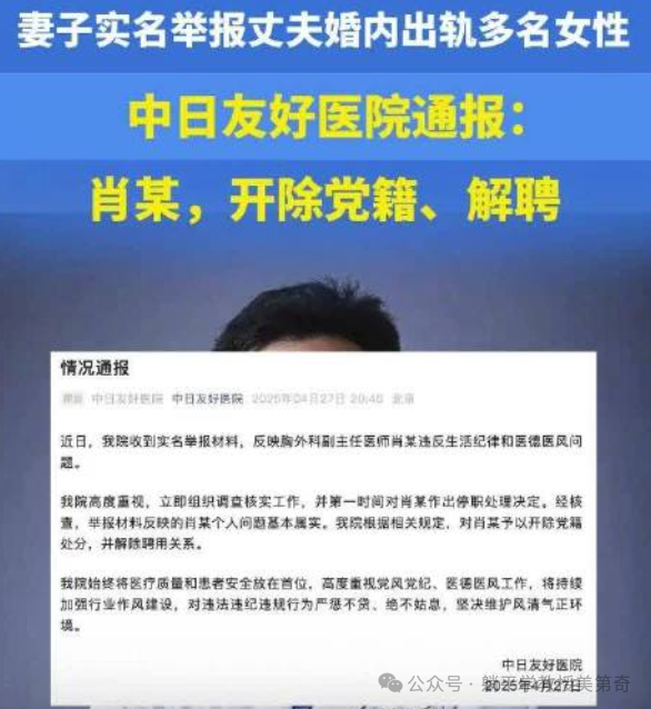 前几天,中日医院某医生的八卦,红了一遍互联网。北京著名头牌医院胸外科副主任肖某被妻子实名举报婚内出轨多人,且被曝因情感原因在手术中擅自离开长达40分钟,最终医院发布公告,确认了相关情况,开除了肖某。