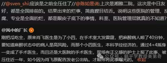 所以这个协和的大夫五年出轨四个,倒也不是特别离谱。当然,因为处理桃花债,能把麻醉中的患者晾在手术台上四十多分钟,倒是也是相当的神奇。