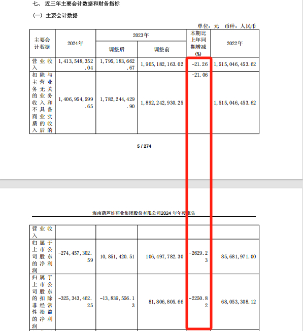 三是葫芦娃2024年度财报被出具保留意见的审计报告,并且2024年度归母净利润为-2.74亿元,同比下降2629.23%。