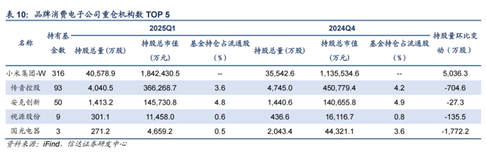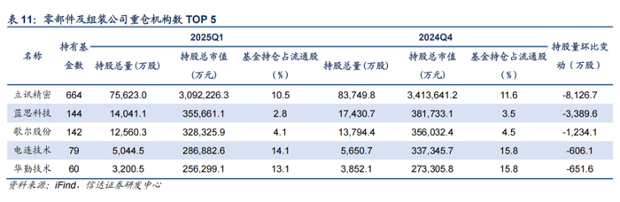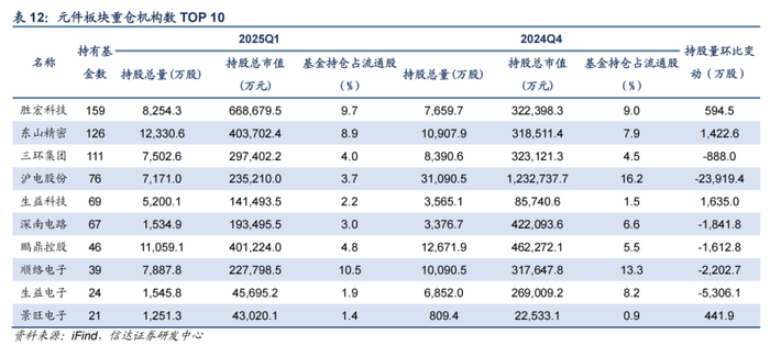 2025Q1,元件板块机构持仓市值占比为2.29%,环比下降0.69pct。此轮调整主要受到海外AI产业链影响,沪电股份、深南电路等机构持股降低,而生益科技、东山精密等获得机构加仓较多。我们认为从海外CSP资本开支计划来看,AI需求仍然具备较强确定性,同时DeepSeek降低AI大模型门槛有利于拉动整体算力需求增长,算力产业链中长期或将持续受益,同时也建议关注机器人对上游元件需求的拉动。
