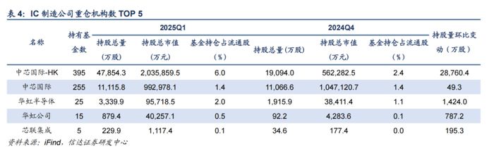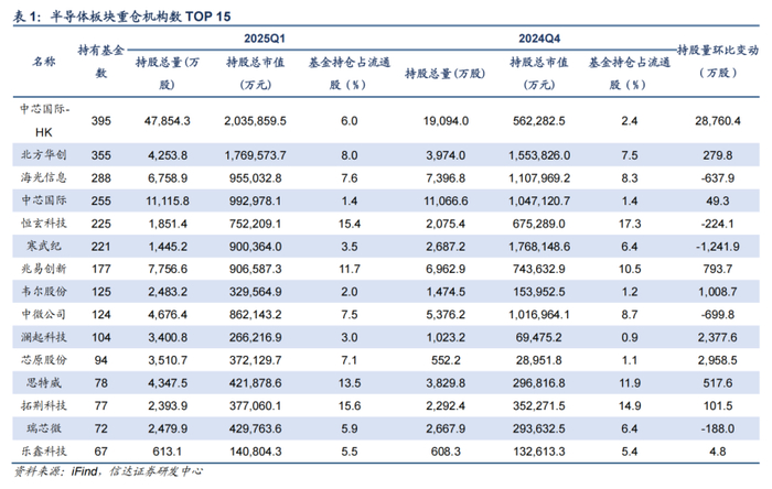 半导体板块:中芯国际港股获大幅加仓,自主可控主线突出。2025Q1,半导体板块机构持仓市值占比为11.01%,环比上季增加1.67pct。从基本面情况来看,2025年半导体下游景气度逐步回暖,多领域库存水位降至较低位置;外部环境看,一月份美国BIS发布关于人工智能扩散的临时最终规则,同时对16nm及以下制程芯片流片进行制裁,强化了市场对自主可控逻辑的认可;技术发展上看,国产AI芯片不断突破,同时ASIC需求弹性显现。从机构仓位配置的角度来看,中芯国际港股、芯原股份、澜起科技、韦尔股份、兆易创新等获得机构加仓较多。
