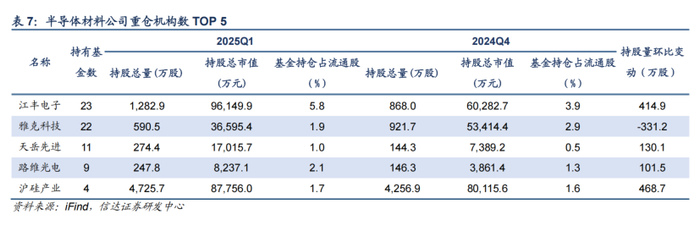 电子化学品板块:国产替代持续,Q1持仓市值占比继续提升。2025Q1,电子化学品板块机构持仓市值占比为0.49%,环比上季度提升0.11pct。2025年以来,伴随科技自主可控逻辑的演绎,上游电子化学品的国产替代不断受到重视,关键领域的突破刻不容缓。2025Q1,广钢气体、鼎龙股份、莱特光电等获得机构加仓较多。