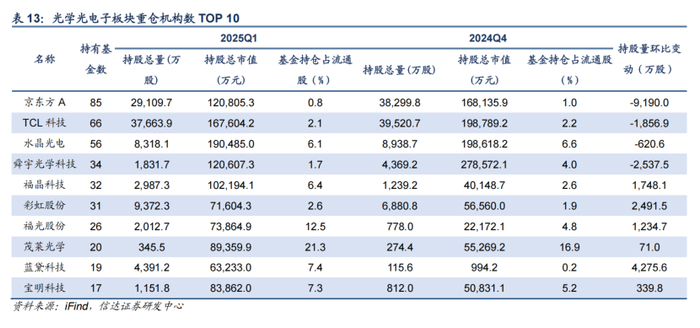 2025Q1,光学光电子板块机构持仓市值占比为0.82%,环比提升0.15pct。从机构仓位配置的角度来看,蓝黛科技、彩虹股份、福晶科技等上市公司获得机构加仓较多。2025年国补政策刺激下游家电和消费电子需求,对光学板块有一定拉动作用。在国内外备货需求高涨的情况下,面板厂虽小幅提升LCD TV高世代产线稼动率,但供应仍然偏紧,根据WitsView数据,一季度大尺寸面板价格持续上升。