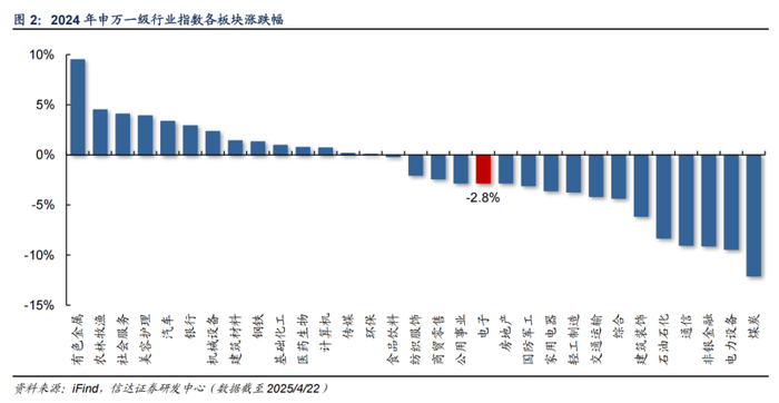 2025年初至4/22电子指数下跌2.8%。2025年初以来,由DeepSeek掀起开源模型的热潮,重塑国产AI大模型和算力产业链的估值体系,一季度国内算力产业链表现相对强劲,且DeepSeek蒸馏模型大幅降低AI门槛,端侧AI持续演绎。从外部环境上看,美国对华芯片制裁也在不断强化,自主可控主线凸显。但是进入四月以来,特朗普关税政策不断加码,中国政府坚决反制,对电子板块形成较大干扰。2025年初至4/22,申万电子指数下跌2.8%。