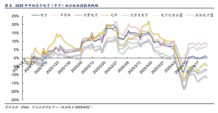 半导体、电子化学品板块上涨,消费电子板块有所调整。从细分板块的涨跌幅来看,2025年初至4/22,电子整体上涨0.8%,子板块半导体、消费电子、元件、光学光电子、电子化学品分别变动9.0%、-11.9%、-4.7%、-6.7%、8.0%。下跌主要受到美国关税政策影响,若只看一季度表现,子板块均有所上涨,半导体、消费电子、元件、光学光电子、电子化学品分别上涨8.9%、6.7%、10.0%、0.9%、8.6%。